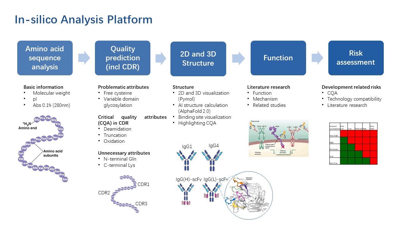 In-silico分析可基于序列、多種數(shù)據(jù)庫(kù)、結(jié)構(gòu)預(yù)測(cè)模型和平臺(tái)經(jīng)驗(yàn),為CMC研究提供詳實(shí)的理化參數(shù)(如pI、消光系數(shù)、分子量、二硫鍵、疏水性、糖基化位點(diǎn)、N-/O-糖型等)和潛在產(chǎn)品相關(guān)雜質(zhì)(如氧化、脫酰胺、聚集、斷裂、高級(jí)結(jié)構(gòu)異質(zhì)等)。