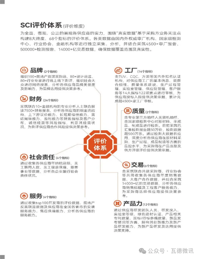 2024年,采筑供應(yīng)商綜合指數(shù)SCI全面升級:1、測評模型優(yōu)化:新增了政府平臺、國央企采購商關(guān)注的綠色工廠、綠色建材、綠色供應(yīng)鏈等測評指標;2、測評范圍擴大:本次測評涵蓋91個品類,2600多家供應(yīng)商參評,測評的供應(yīng)商數(shù)量增加50%,測評范圍也從供應(yīng)商擴展到與之相關(guān)的經(jīng)銷商、安裝商;3、升級并開放SCI智能測評系統(tǒng):可支持采購方自由選擇關(guān)注的指標及算分規(guī)則,為客戶提供根據(jù)自身需求定制的評估模型,快速生成評分;4、采信范圍擴大:采筑聯(lián)采資信標采信SCI測評得分,更多的采購商客戶通過采信SCI測評數(shù)據(jù)進行品牌庫建設(shè)。二、SCI三大特點:無濾鏡、無雜質(zhì)、無廣告SCI評價資料真實。測評資料來自房地產(chǎn)商、設(shè)計院、建筑單位、檢測機構(gòu)、金融機構(gòu)、供應(yīng)商、第三方數(shù)據(jù)平臺等渠道,覆蓋整個產(chǎn)業(yè)鏈。SCI基于評價模型對資料進行比對和甄別,提升資料的真實可靠性。SCI評價數(shù)據(jù)豐富。4500多份供應(yīng)商審廠報告、50萬余份產(chǎn)品檢測報告、7500余份財務(wù)報表,200多家共建單位線上線下專項測評、上萬大眾參與投票。采筑將SCI評價內(nèi)容與行業(yè)權(quán)威機構(gòu)的供應(yīng)鏈管理成果充分結(jié)合,輸出2024《采筑建材行業(yè)指南》,為行業(yè)提供一份客觀公正,能快速摸清產(chǎn)品力風(fēng)向,全方位了解供應(yīng)商實力的供采合作指導(dǎo)工具書,輔助采購商客戶準確、快速決策,佐證供應(yīng)商綜合實力。