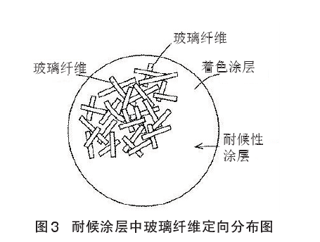 該高耐候性彩色水泥瓦制作流程是將以水泥為主要成分的坯料擠壓成坯,瓦體養(yǎng)護硬化,涂以涂料,修平整,形成底層涂膜層。為了防止瓦中堿分對上層涂膜層的侵蝕,可在底涂膜層上,涂以耐堿性涂料,形成耐堿涂膜層,然后涂以著色涂料,形成裝飾涂膜層,最后涂以耐候涂料,形成耐候涂膜層(見圖1和圖2)。著色涂層由含有所需著色顏料的水性丙烯酸涂料構(gòu)成,其厚度約為100μm。耐候性涂層由與著色層相同的水性丙烯酸涂料與耐候性纖維(添加量為7%~12%)組成的涂料構(gòu)成,其厚度約為 25μm。耐候性涂料用噴槍高壓噴涂在瓦著色裝飾涂層上。耐候性涂料涂覆在著色涂層上時,玻璃纖維以平躺姿態(tài),水平方向無序隨機定向分布(見圖 3)。對瓦涂以耐候性涂料后,為了固定玻璃纖維,約在100℃下充分干燥。