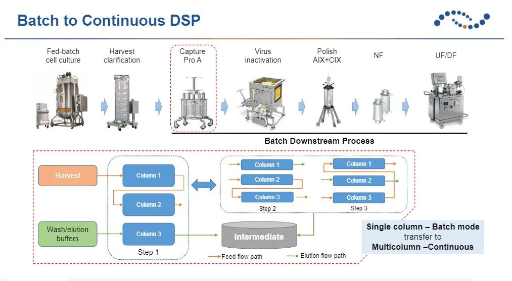 因應(yīng)細(xì)胞培養(yǎng)表達(dá)量大幅提升后而對(duì)下游純化所帶來(lái)的壓力, 漢騰生物以親和多柱層析的先進(jìn)技術(shù)來(lái)提高填料使用效率。由于單柱親和柱會(huì)有樣品流穿的問(wèn)題, 因此填料的使用效率往往都只有40%以下, 而多柱聯(lián)用可把填料的使用效率提升至90%以上, 進(jìn)而顯著的降低填料使用量。與傳統(tǒng)的批次純化方式相比, 多柱連續(xù)層析技術(shù)可讓填料使用量減少高達(dá)80%。